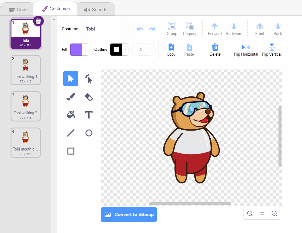 The costumes available for the sprite are shown in the Costume tab, next to the Code tab on the extreme left.